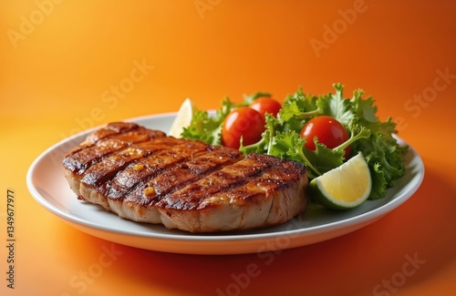 Grilled meat steak on white plate with fresh salad, cherry tomatoes, lemon slice. Food on orange background. Dinner lunch concept. Restaurant serving dish.