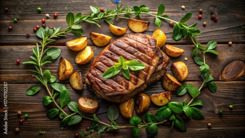 Grilled meat steak with roasted potato wedges and fresh herbs on rustic wooden surface