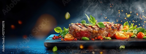 Grilled Meat with Fresh Vegetables and Aromatic Herbs on Wooden Board