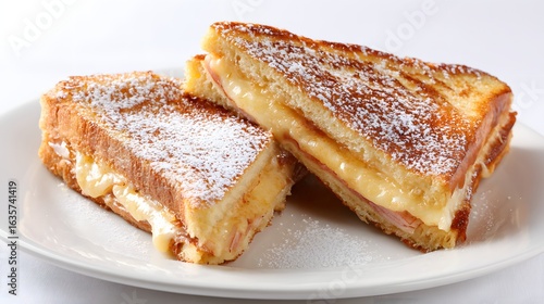 Grilled Monte Cristo sandwich with powdered sugar on white plate.