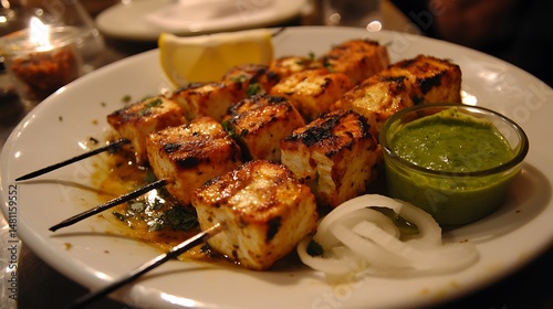 Grilled Paneer Tikka with Green Chutney and Onion Slices