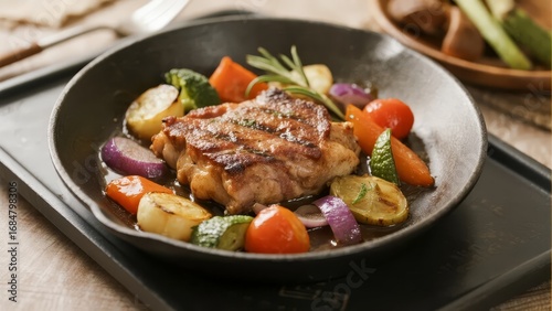 Grilled Pork Chop with Roasted Vegetables on a Black Plate