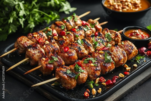 Grilled pork satay skewers with peanut sauce