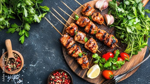 Grilled pork skewers with fresh herbs and spices on a wooden board dark background