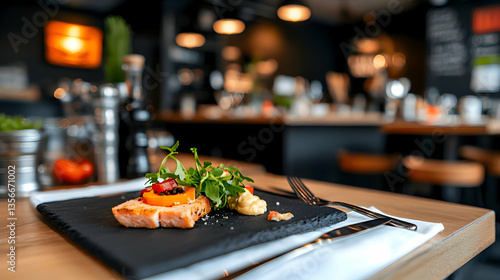 Grilled Salmon Dish with Herbs on Dark Slate Plate in Restaurant Setting