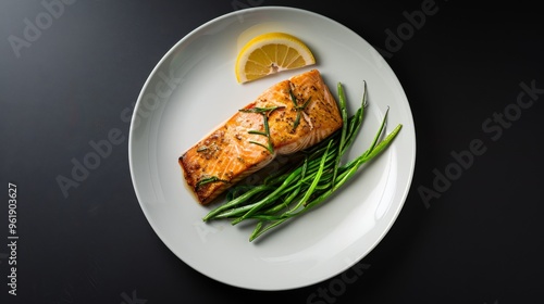Grilled salmon fillet served elegantly on a white plate with green beans and a lemon wedge, contrasting against a dark backdrop.