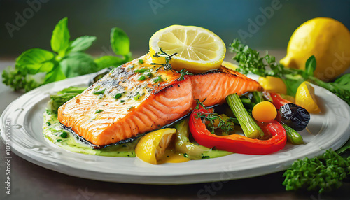 Grilled salmon fillet served with fresh vegetables and lemon slices on a decorative plate with herbs