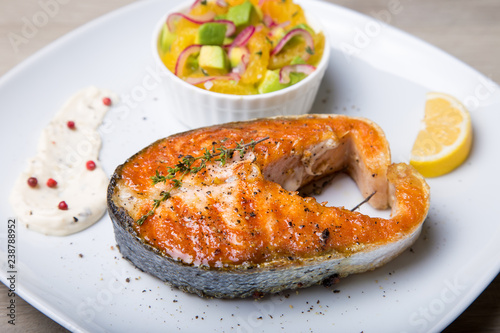 Grilled salmon, salad with oranges and avocado. Close-up, selective focus.