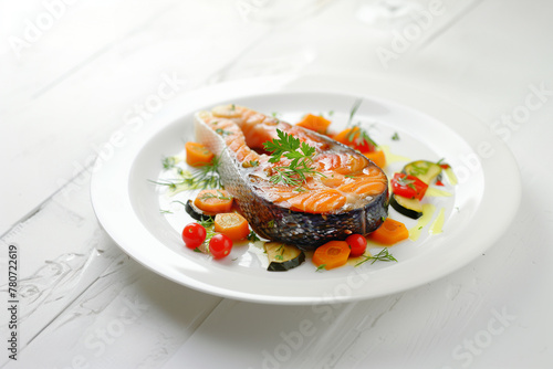 Grilled salmon steak with vegetables on a plate