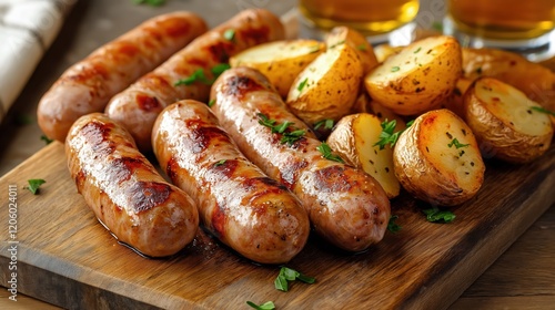 Grilled sausages served with roasted potatoes and fresh herbs on a wooden board