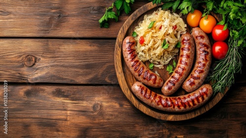 Grilled Sausages Served with Sauerkraut on Wooden Table