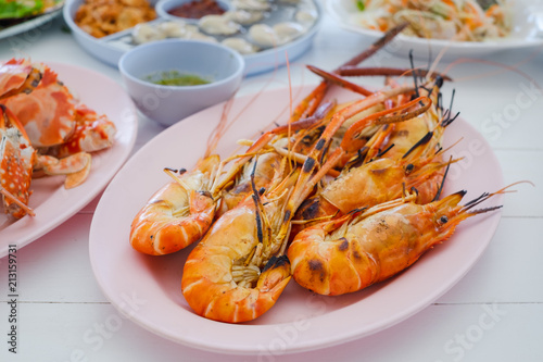 grilled shrimp on dish with spicy seafood saucebrown wooden table background..