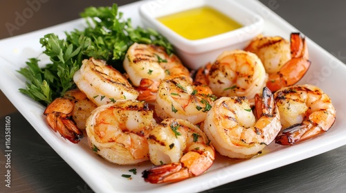 Grilled shrimp served with a side of olive oil and garnished with fresh herbs on a white plate.