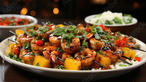 Grilled Shrimp Skewers with Pineapple Salsa on Blurry Background