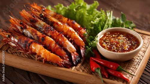 Grilled Shrimp with Fresh Green Lettuce and Spicy Dipping Sauce on Wooden Serving Board