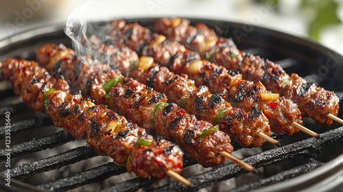 Grilled skewers of marinated meat and vegetables sizzling on a barbecue grill outdoors (1)
