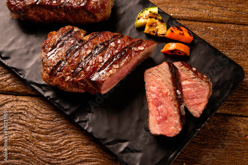 Grilled sliced beef steak on a black cutting board on the wooden table