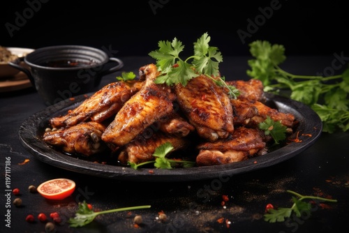 Grilled spiced chicken wings on black plate