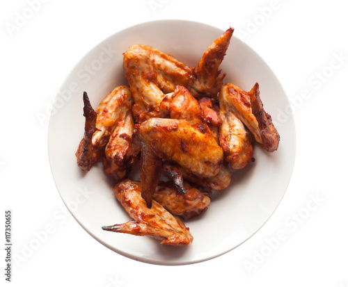 Grilled spicy chicken wings in white dish. Chicken wings isolated on white background.