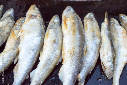 grilled spicy fish closeup. Cooking, the process. Fried fish for lunch or dinner.