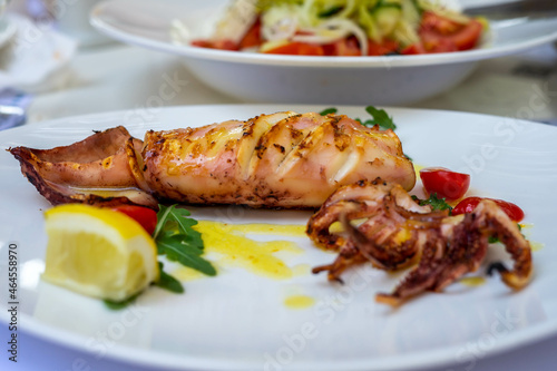 Grilled squid with lemon and cherry tomatoes in Thassos, Greece