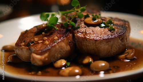Grilled steak, fresh vegetables, and savory sauce on a plate generated by AI