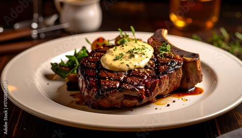 Grilled steak on white plate, sauce drizzled. Vegetables alongside, blurry background, wood table