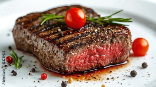 Grilled steak, rosemary, cherry tomatoes, restaurant plating
