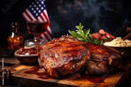 Grilled steaks on wooden cutting board represent a festive american tradition, accompanied by various sauces, side dishes, and a small flag