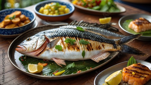 Grilled Tropical Fish Display with Tambaqui and Matrinxa on a Rustic Table Surrounded by Fresh Sides and Garnishes