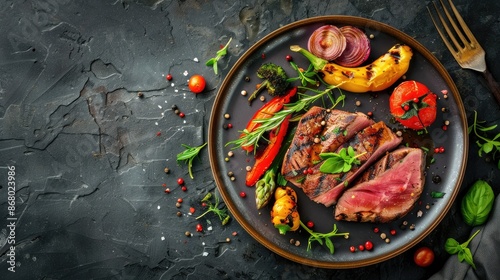 Grilled tuna steak and roasted vegetables on a plate with space for text