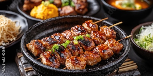 Grilled yakitori skewers with chicken and green onions served in a black bowl surrounded by sides of colorful Japanese dishes on a dark surface