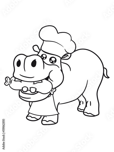 grilling, cook, chef, hotdog meat tasty food hungry grill master apron chef hat sweet little cute baby hippo happy child