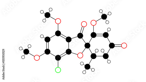 griseofulvin molecule, structural chemical formula, ball-and-stick model, isolated image antifungal medication
