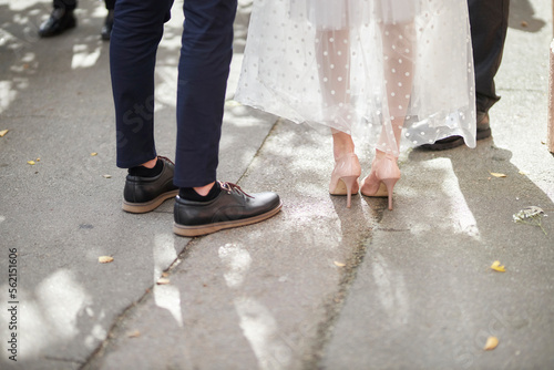 Groom and bride legs close-up. Wedding Husband and wife are standing next to each other.