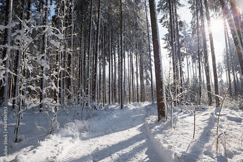 groomed walkway in sunny winter forest