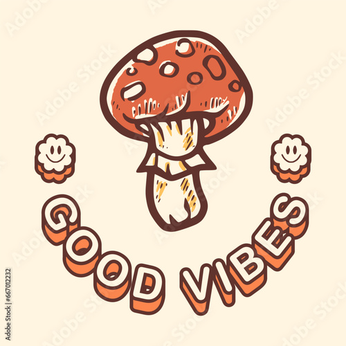 Groovy hippie 70s sticker. Funny cartoon fly agaric or psychedelic mushroom. Sticker in trendy cartoon style 60s. Good vibes. Stay groovy