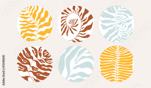 Groovy icons in Matisse style, abstract flora. Vector illustration. Set of icons and emblems for social media news covers. Design templates for yoga studio, tourism, beauty salons