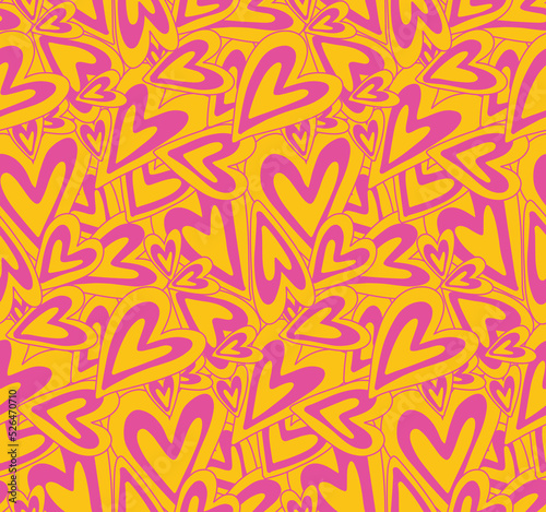 Groovy purple yellow hearts Y2K 90s seamless pattern vector background. Retro hippie romantic repeat texture wallpaper, textile design.