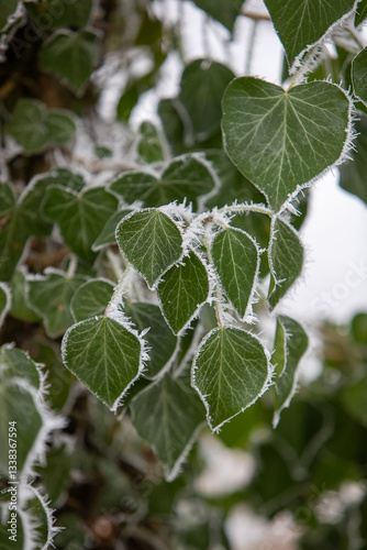Gros plan de feuilles de lierre vertes recouvertes de givre sur un tronc d'arbre dans une forêt. Scène hivernale de forêt hivernale avec des branches et des feuilles givrées.