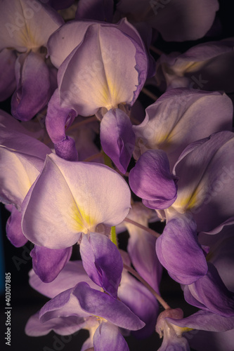 gros plan sur grappe de fleurs de glycine sur fond noir