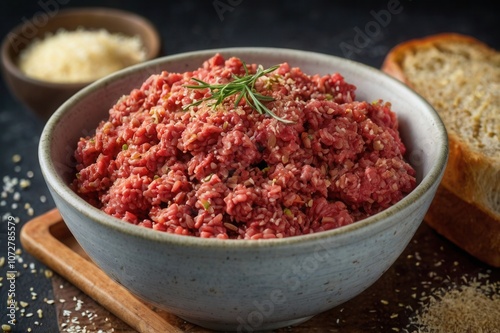 Ground beef in a bowl, ready for making meatballs, with seasoning.