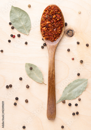 Ground chili in wooden spoon on wooden background
