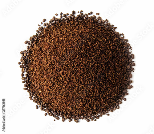 Ground Coffee Beans: A top-down shot of freshly ground coffee, presenting a rich, inviting texture and deep brown color. The image suggests the aroma and taste of a perfect cup of coffee.