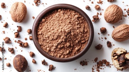 Ground Nutmeg in a Wooden Bowl with Whole Nutmeg