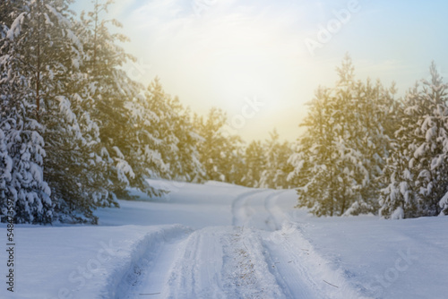 ground road among snowbound fir tree forest at the sunset, idyllic soft outdoor scene