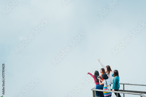 group asian woman traveler open arms and embracing nature from top of mountain in spring season