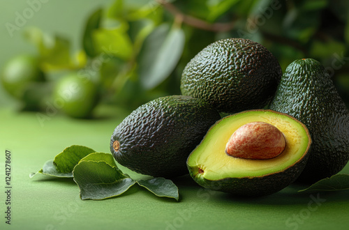 Group avocados, leaves green, sliced, top view avocado leaves, space text, vegetarian food, vitamin