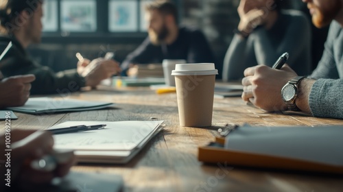 Group discussion with coffee cups and notebooks on a wooden table in a modern workspace.