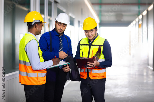 Group Ethnic diversity engineering team worker people, Success teamwork. Group of professional engineering people wearing hardhat safety helmet meeting discussion in new project at warehouse factory